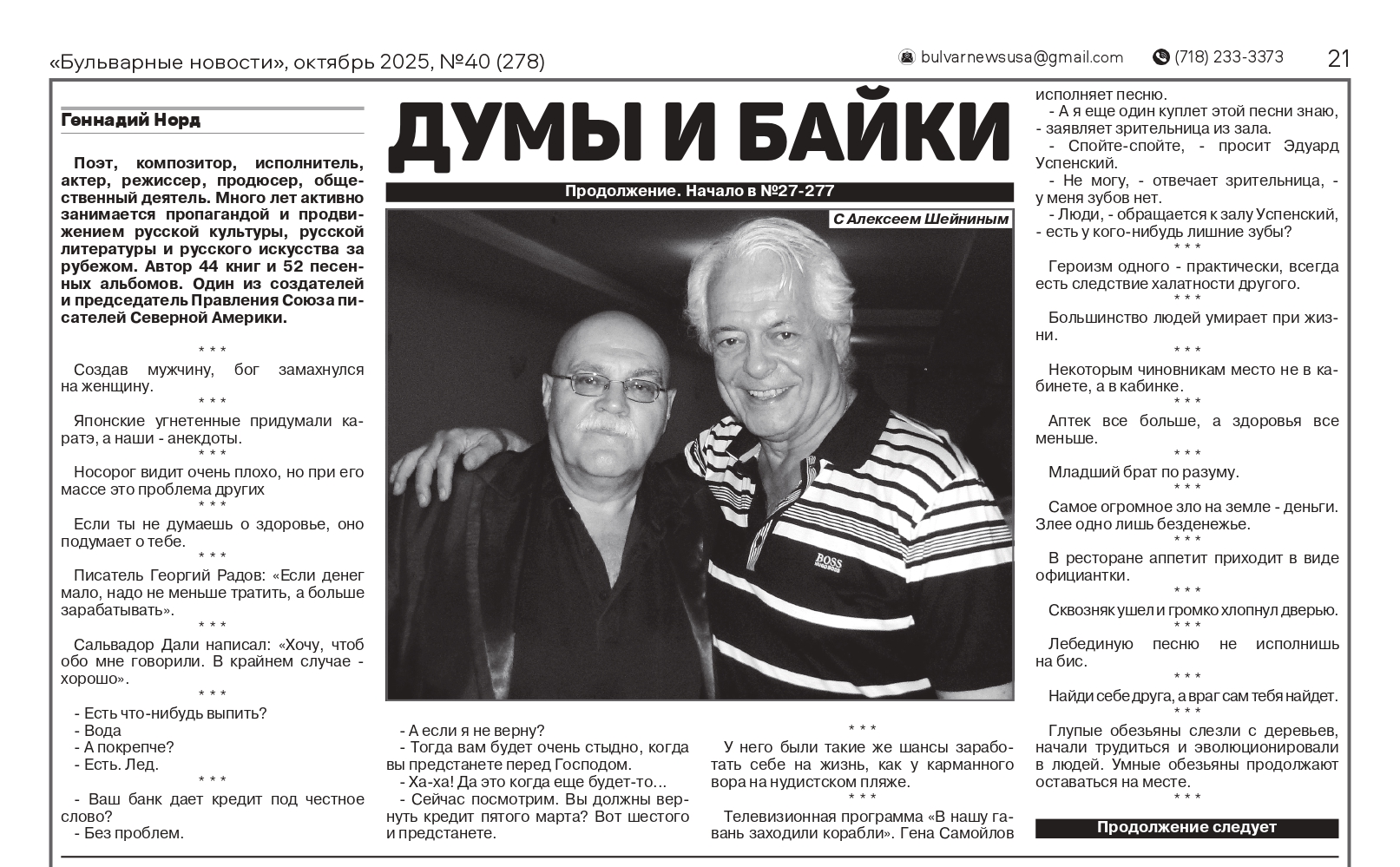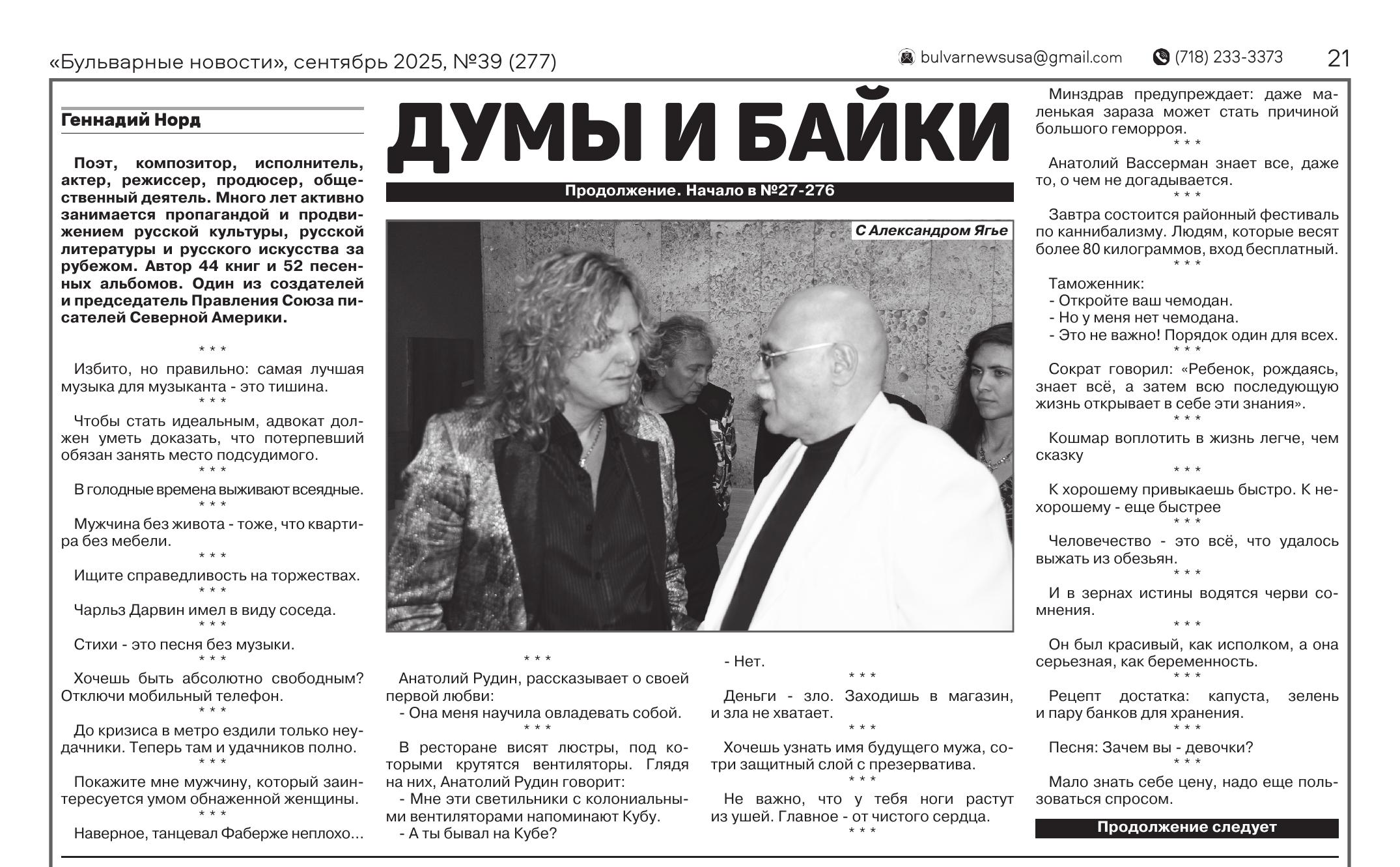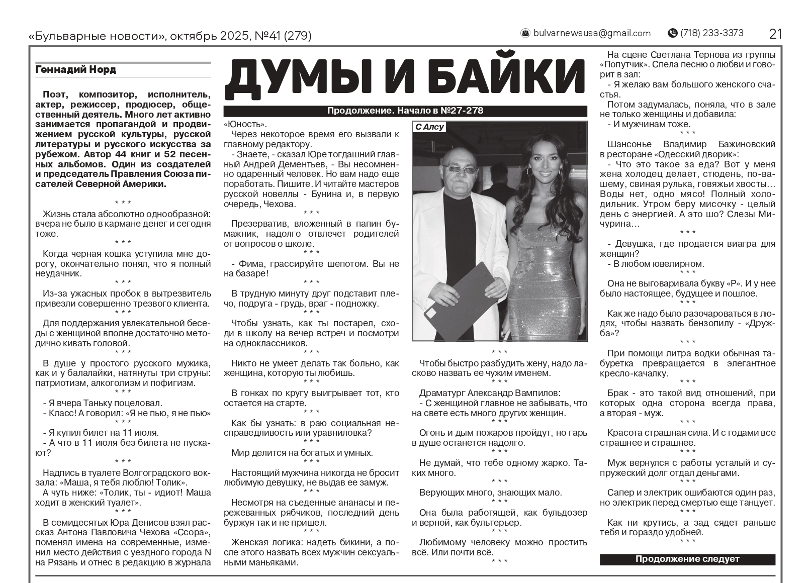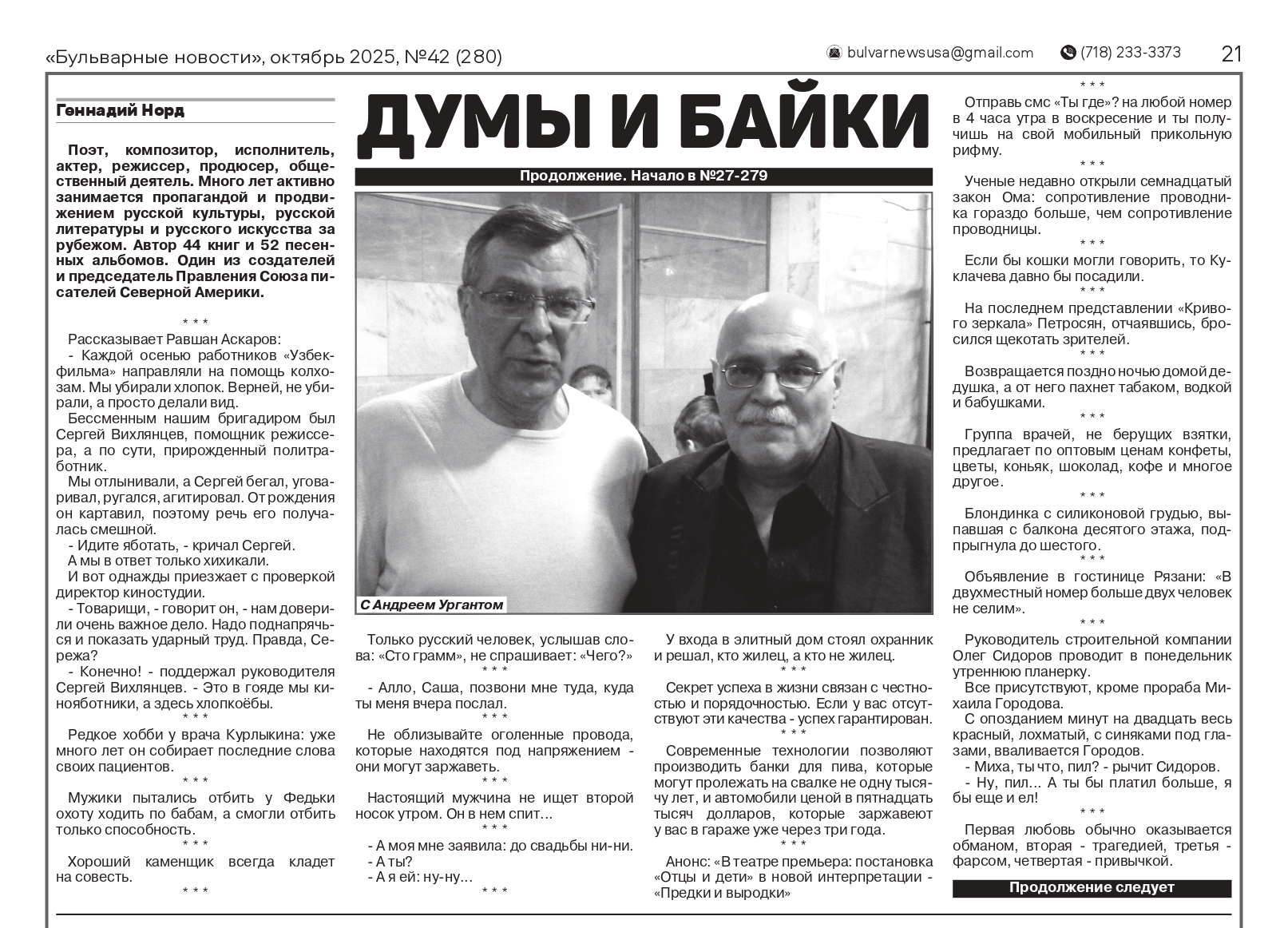 В газете «Бульварные новости» продолжается публикация баек из серии книг Геннадия Норда «Заметки из барсетки»
