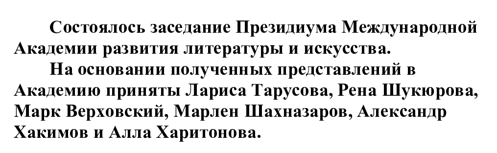 Правление Союза писателей Северной Америки приняло решение создать Международную Академию развития литературы и искусства - МАРЛИ.