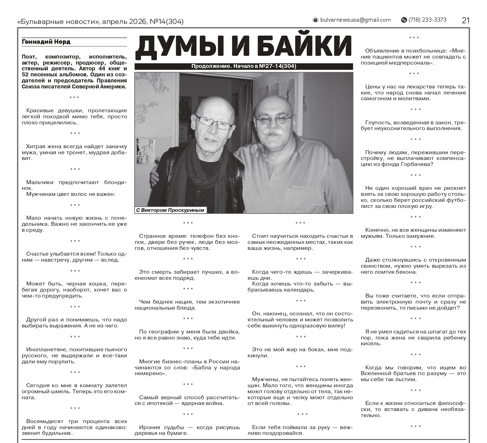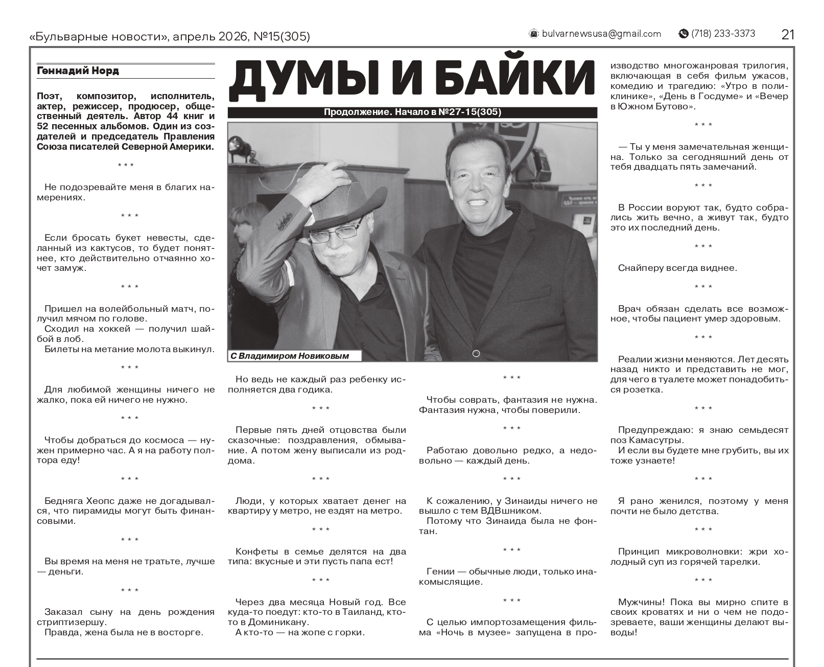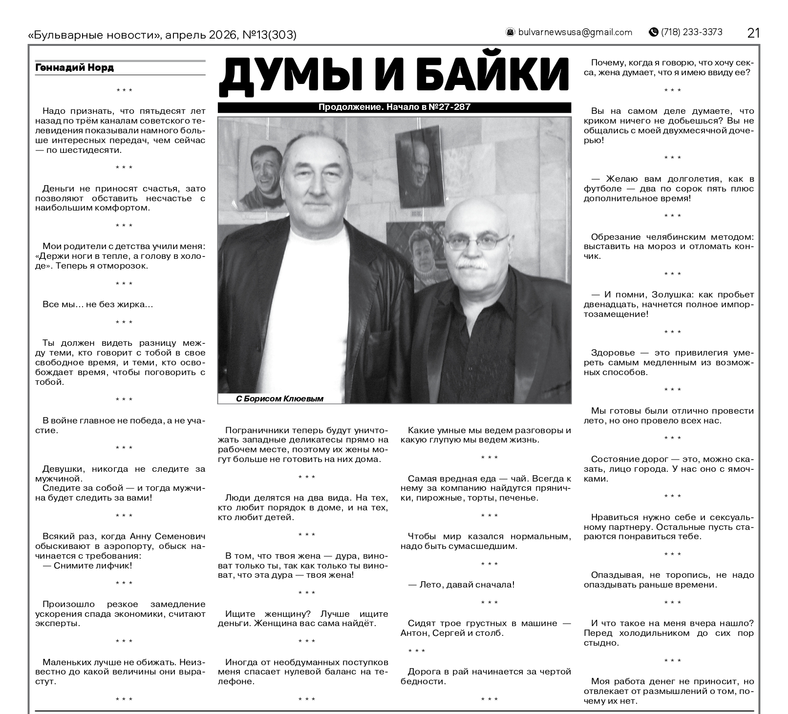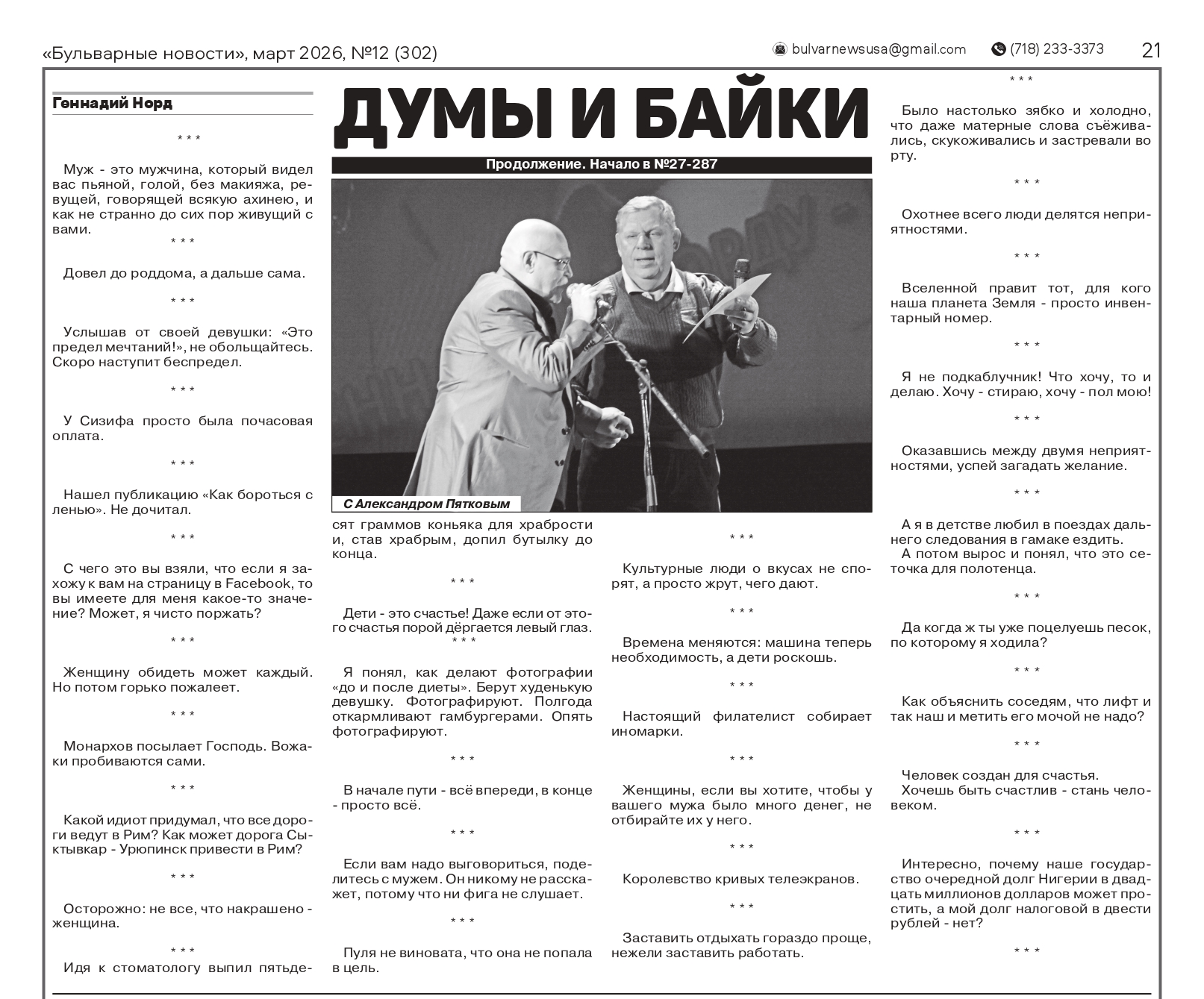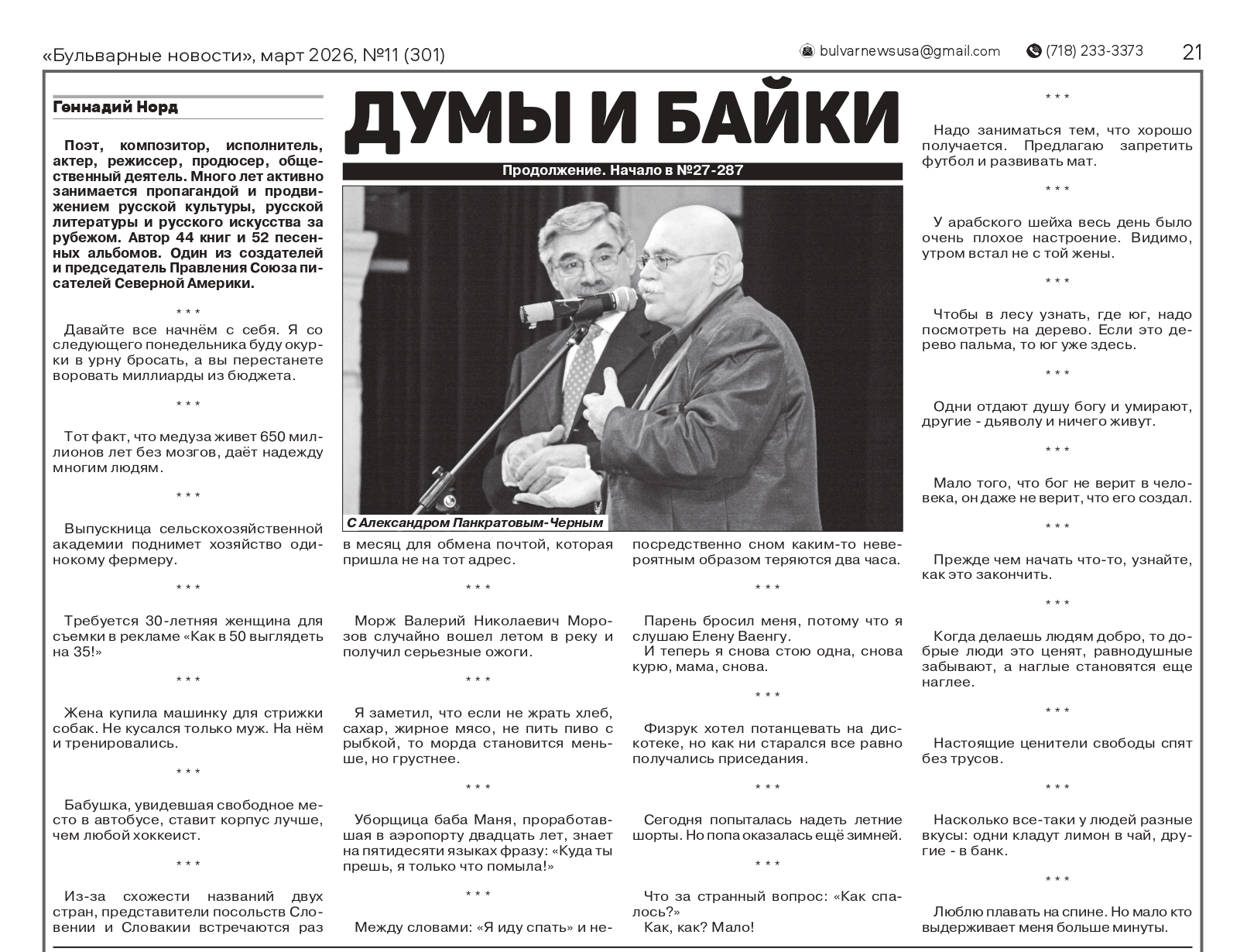 В газете «Бульварные новости» продолжается публикация баек из серии книг Геннадия Норда «Заметки из барсетки»