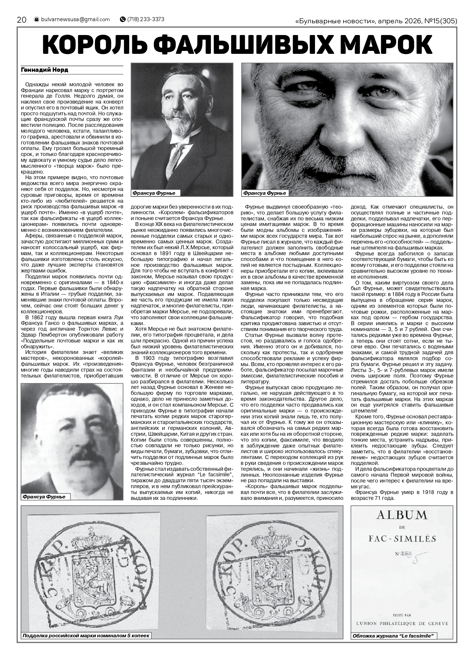 В газете «Бульварные новости» опубликован очерк «Король фальшивых марок»