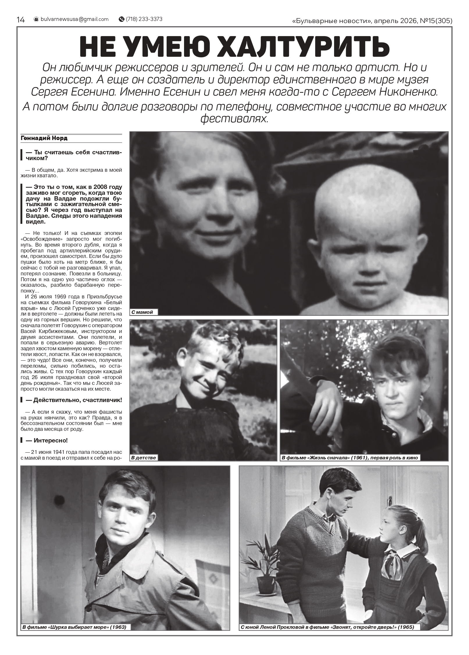 В газете «Бульварные новости» опубликован очерк об артисте Льве Полякове «Жить правдой»