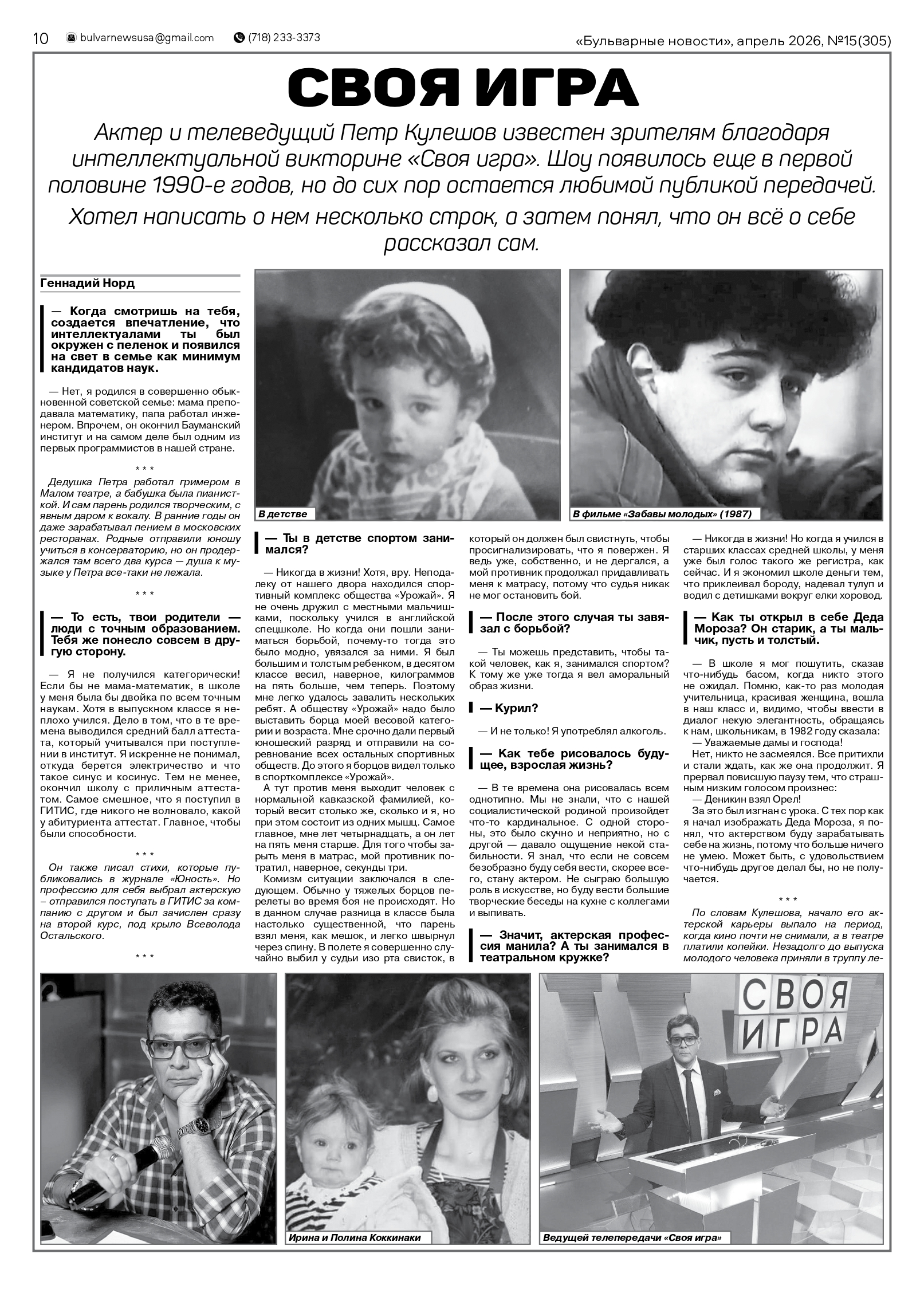 В газете «Бульварные новости» опубликовано интервью с актером и телеведущим Петром Кулешовым «Своя игра»
