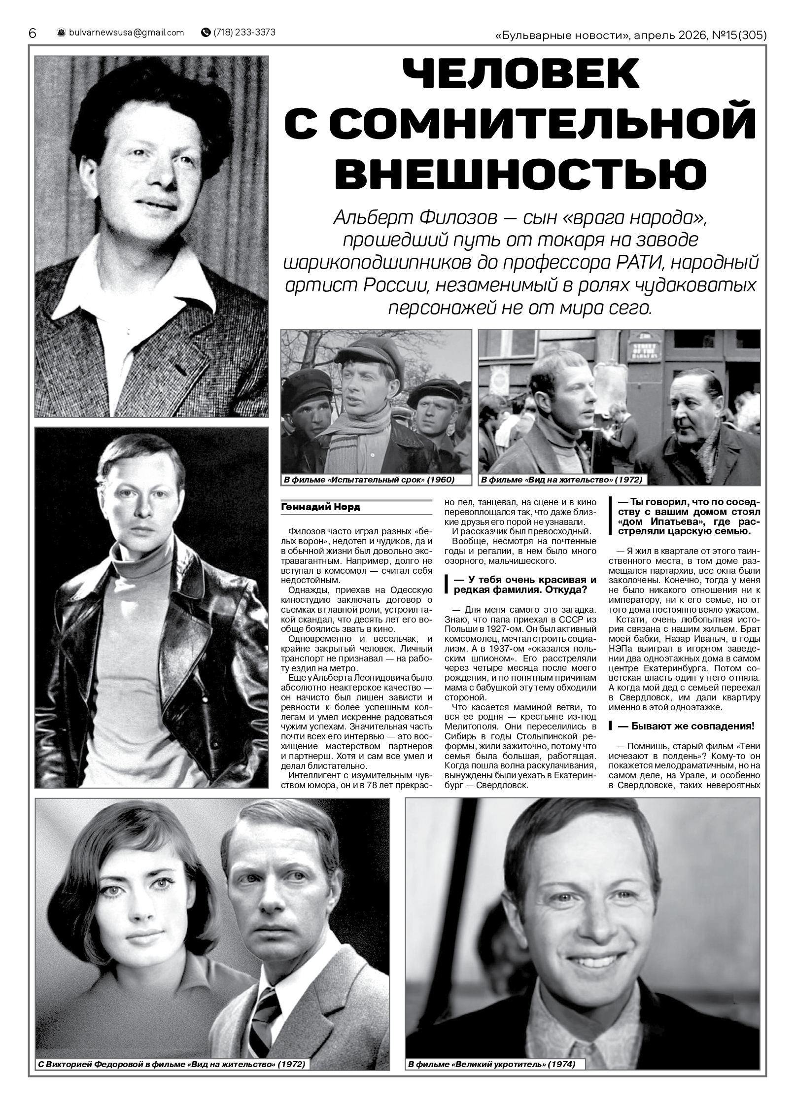 В газете «Бульварные новости» опубликовано интервью с народным артистом Альбертом Филозовым «Человек с сомнительной внешностью»